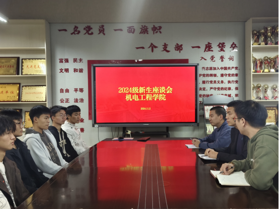 11月5日下午,机电工程学院2024级新生座谈会于A06-418会议室举行。2024级各班班长及学生代表齐聚一堂,与机电工程学院党委副书记陈云飞、学工办副主任刘翔、新生辅导员王益普三位老师共话大学生活,展望美好未来。